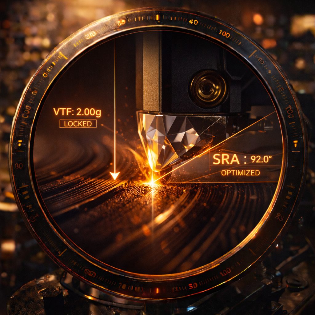 Non si tratta di una regolazione legata all’estetica, ma di una necessità meccanica: attraverso la gestione combinata della Tracking Force e del VTA (Vertical Tracking Angle), l’obiettivo finale è sincronizzare lo Stylus Rake Angle con l’angolo d’attacco del tornio che ha inciso il master originale.